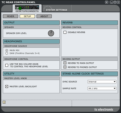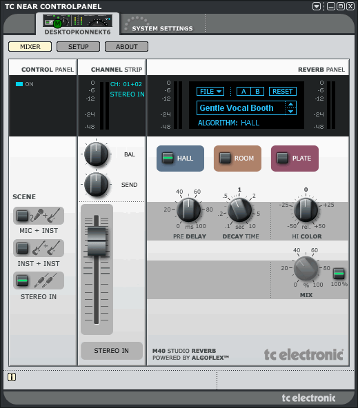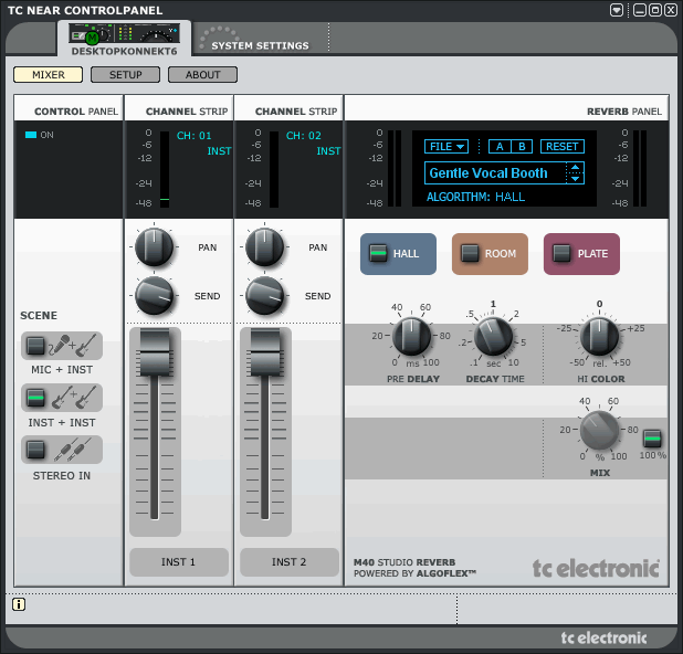 В комплекте с устройством идет студийный ревербератор TC M40. Программный, встроен в контрольную панель, позволяет накладывать обработку на физические входы. M40 олицетворяет новую технологию обработки звука T.C. Electronic — AlgoFlex. Это акроним, составленный из слов алгоритм и гибкий. Означает перенос алгоритмов железок TC в программные плагины. При этом интересно, что интерфейс имеет аппаратную ручку регулировки уровня ревера. Остальные регуляторы всё же виртуальные.