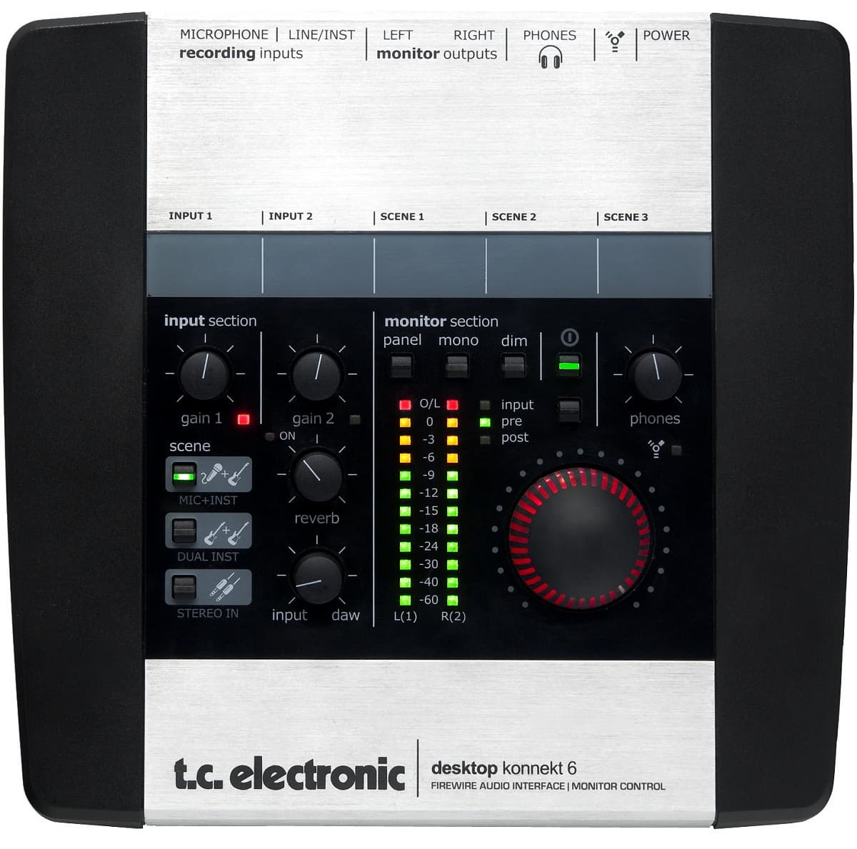 Отличие интерфейса Konnekt 6 начинается с внешнего вида. Прежде всего, это настольное устройство, предназначенное для размещения прямо на рабочем столе, а не в рековой стойке. Устройствами в рэковом и полурэковом корпусе не очень удобно управлять, но зато их можно разместить одно над другим, сэкономив место. В домашней студии это не нужно, поэтому в ней будет предпочтительнее устройство с органами управления на вехней панели, а не на передней. Такое, как Konnekt 6.