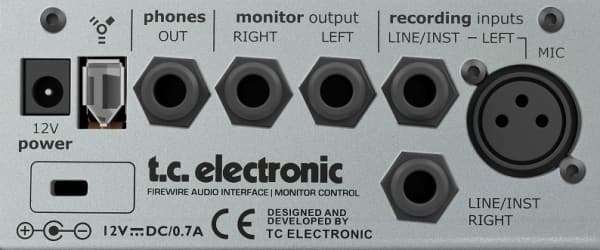 На задней панели интерфейса микрофонный вход XLR с предусилителем IMPACT и подачей дополнительного фантомного питания 48 Вольт, гитарный вход, балансный выход на мониторы, выход на наушники и разъём для подключения кабеля FireWire.
