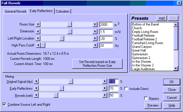 Чрезвычайной гибкостью и хорошим качеством отличаются имитаторы, работающие не в режиме реального времени. Например, в популярном аудиоредакторе Cool Edit Pro можно обнаружить ревербератор, моделирующий всевозможные помещения с кучей сопутствующих настроек: