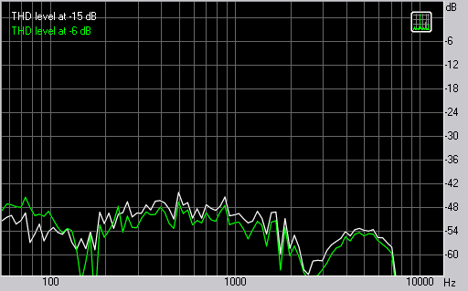 Перейдем к измерениям гармонических искажений. Мы измеряем уровень искажений в логарифмическом масштабе, так как восприятие человека линейно пропорционально логарифму. Для ориентира -20 дБ = 10%, -40 дБ = 1%, -60 дБ = 0,1%.