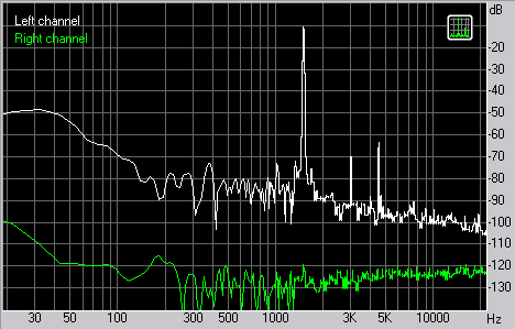 На приведенных спектрограммах мы можем отчетливо видеть, что действительно при подаче синуса уровень третий гармоники высок. Между тем спектр достаточно чистый и никаких паразитный гармоник, кроме второй и третьей нет вообще.