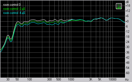 Настройка Room Control служит для ослабления низких частот. Как можно видеть из измерений на заявленной частоте 500 Гц при соответствующих положениях тумблера амплитуда сигнала действительно уменьшается на 2 дБ и 4 дБ.