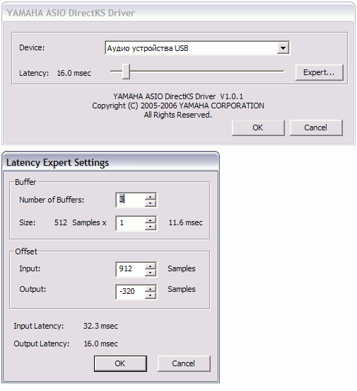 При вызове контрольной панели есть возможность задать размер буфера и компенсацию задержки в семплах, для синхронной работы записи и воспроизведения. Такие возможности, естественно, отсутствуют со стандартными драйверами Windows.