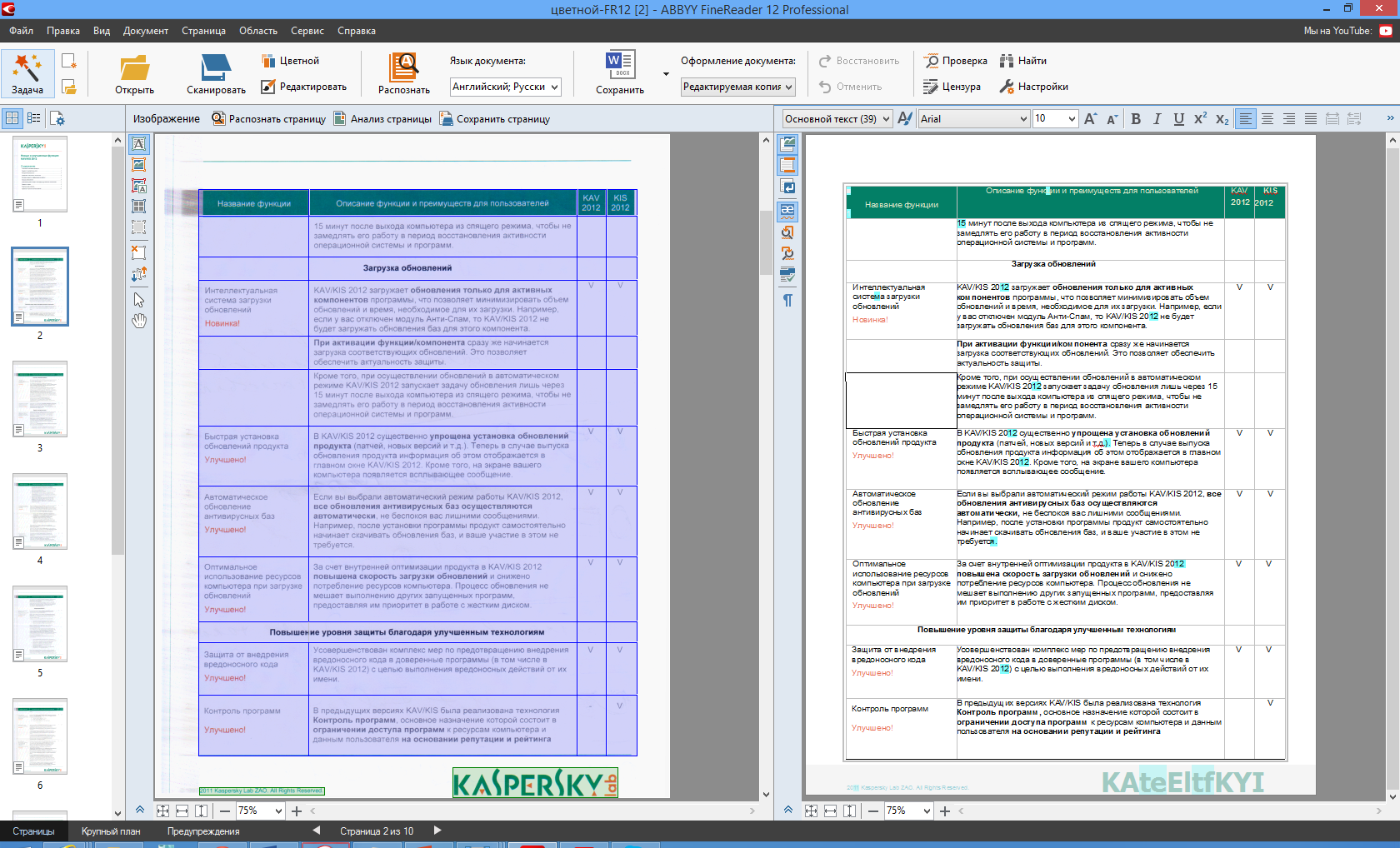 В отличие от прежней версии, также не происходит перелистывания страниц по мере распознавания или при начальной загрузке документа, если автоматическое распознавание отключено. В Abbyy FineReader 12 Professional документ загружается и разбивается на страницы практически мгновенно, а их эскизы строятся только по мере ручного пролистывания в левой панели. Кроме всего прочего, тем самым экономятся вычислительные ресурсы, причем, довольно ощутимо на больших многостраничных документах.