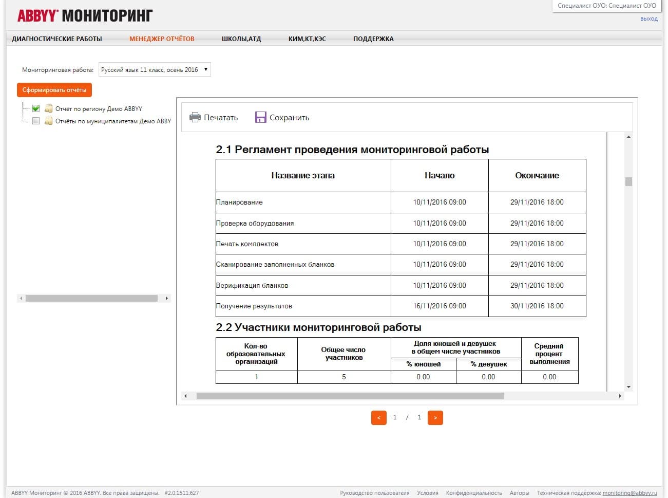 А как выглядит процесс на более высоком уровне — например, для сотрудника, ответственного за мониторинг качества образования на уровне региона? Для такого пользователя Abbyy Мониторинг предоставляется уже в более крупном масштабе, и по конкретной школе он видит общую информацию: активный этап работы, средний балл и т. п. На основе данных формируются отчеты, сочетающие большие объемы данных в формате удобных диаграмм. Отчеты можно выгружать в различных форматах, совместимых с большим количеством сторонних программ.
