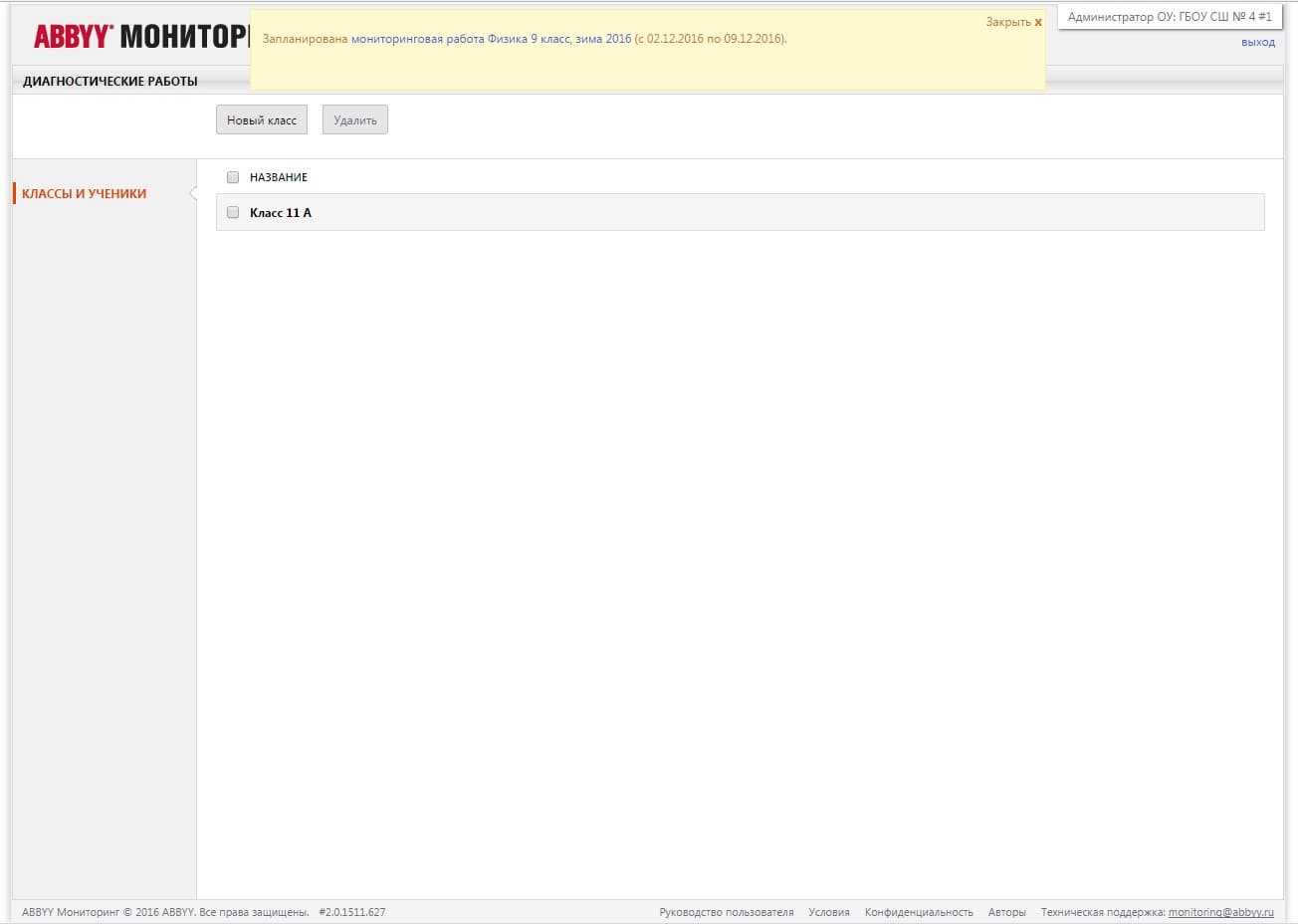 Стартовое окно содержит общий список классов в школе и уведомления о запланированной проверке. Основные операции проводятся в окне «диагностические работ». Здесь с краткой информацией по вкладкам школьных предметов размещен список всех тестирований.