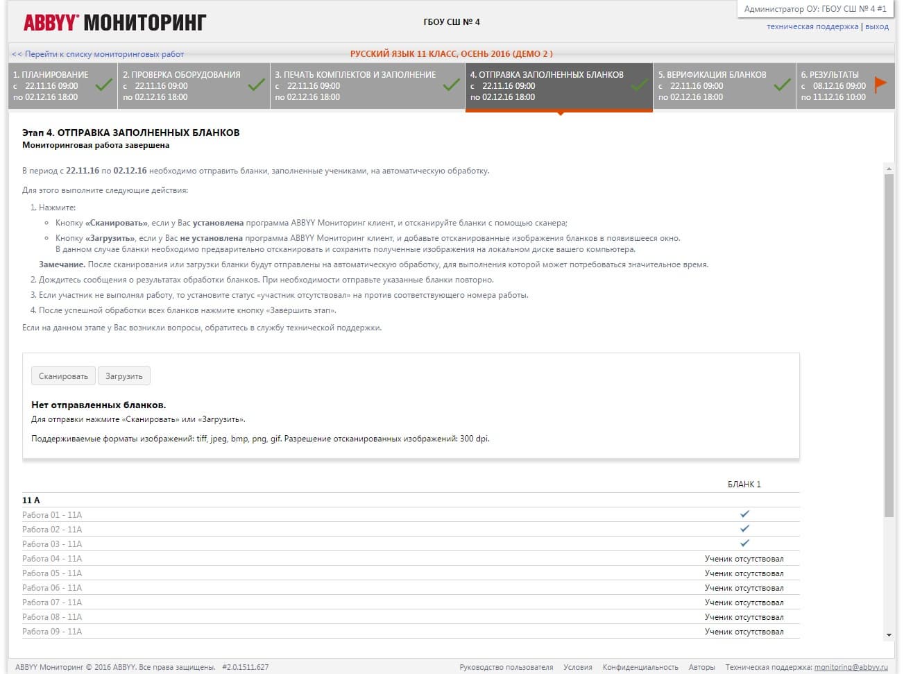 Заполненные тестовые бланки сканируются, параллельно автоматически фиксируется их количество, при необходимости преподаватель проставляет отметки об отсутствовавших учениках. Если с обработкой каких-то бланков возникают проблемы, система покажет это. Пока все необходимые бланки не будут отправлены и обработаны, переход к следующему шагу будет заблокирован.