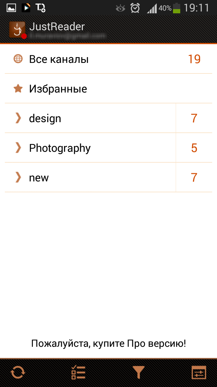Начальный экран JustReader отображает список имеющихся каналов и категорий, избранное. В бесплатной версии приложения, в нижней части экрана отображается еще и баннер с кнопкой для покупки pro-редакции JustReader. Помимо отключения навязчивых напоминаний, pro-версия позволяет использовать несколько аккаунтов одновременно и управлять новостными лентами.