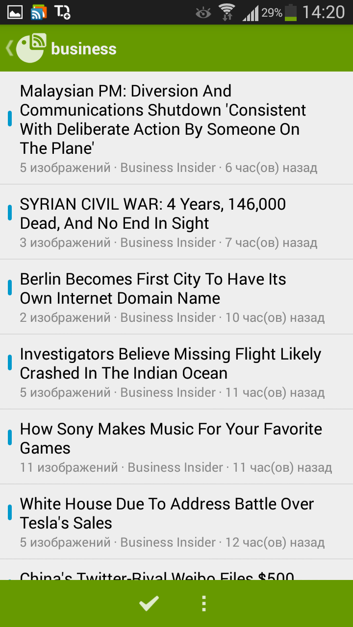 Отображение списка публикаций в FeedMe представлено без каких-либо вариантов: в строке новости отображается заголовок, количество вложенных изображений, время обновления. Список публикаций по мере прокрутки подгружается автоматически, легко отметить все элементы как прочитанные. Показалось немного странным, что при перетаскивании строки в левую или правую сторону не предоставляется никаких дополнительных опций (как это реализовано в других приложениях), при этом перечень операторов в контекстном меню более чем разнообразен.