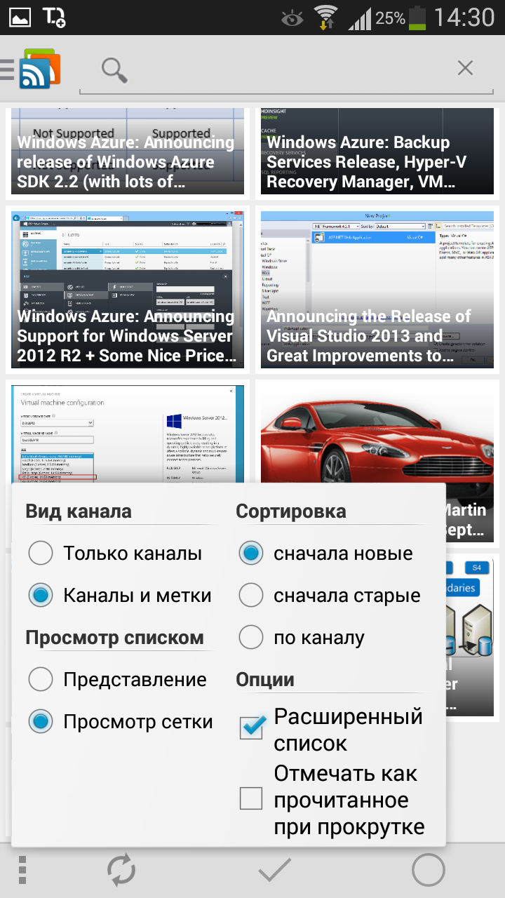 В режиме просмотра списка доступны следующие опции: синхронизация, отметка о прочтении, показ непрочитанных публикаций, сортировка. Замечено, что при работе со списками не всегда отображаются картинки — причем вне зависимости от статуса интернет-подключения.