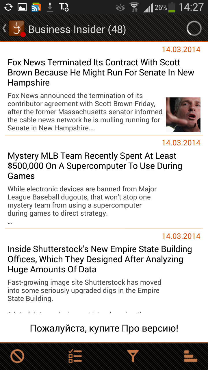 В режиме чтения, зайдя в контекстное меню, можно добавить метку, скрыть изображения, настроить шрифты. Представлены два варианта форматирования. Первый режим, Web, позволяет просматривать новости в оригинальном форматировании. Feed адаптирован для мобильного чтения. Правда, качество реализации данного режима вызывает нарекания. Изображения не всегда вписываются в ширину экрана. Многие элементы отображаются, хотя в мобильной версии они совершенно не обязательны и могли бы быть убраны из виду. Помимо этого, внизу экрана отображается баннер-напоминание о бесплатном использовании продукта. Дополнительные неудобства вносит автономный режим: кэшированная публикация иногда перенаправляет на веб-страницу, наблюдаются неприятные сбои при отсутствии подключения.