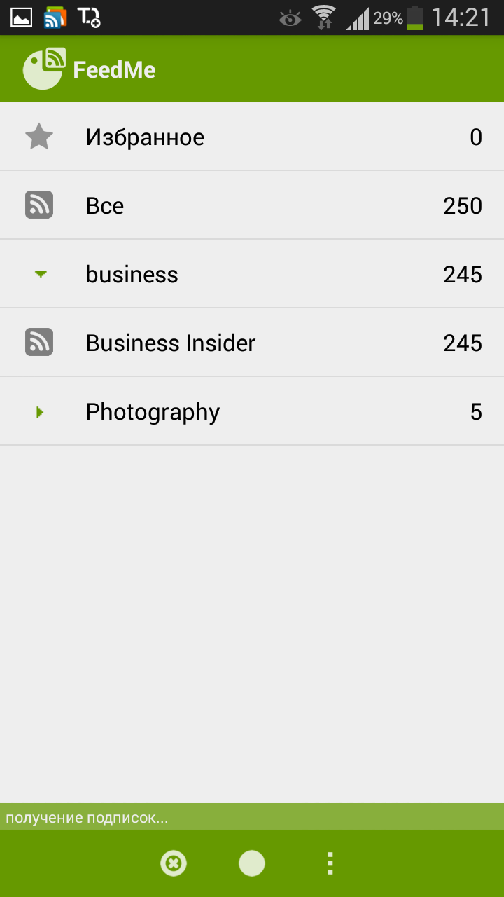 Здесь нет пестрящих лент и обложек, по большей части представлен текстовый интерфейс. Внизу экрана расположено меню, где можно переключиться к непрочитанным сообщениям, синхронизировать ленты вручную или очистить кэш. В FeedMe внимание также уделено уведомлениям о событиях — так, в статусной строке отображается прогресс синхронизации.