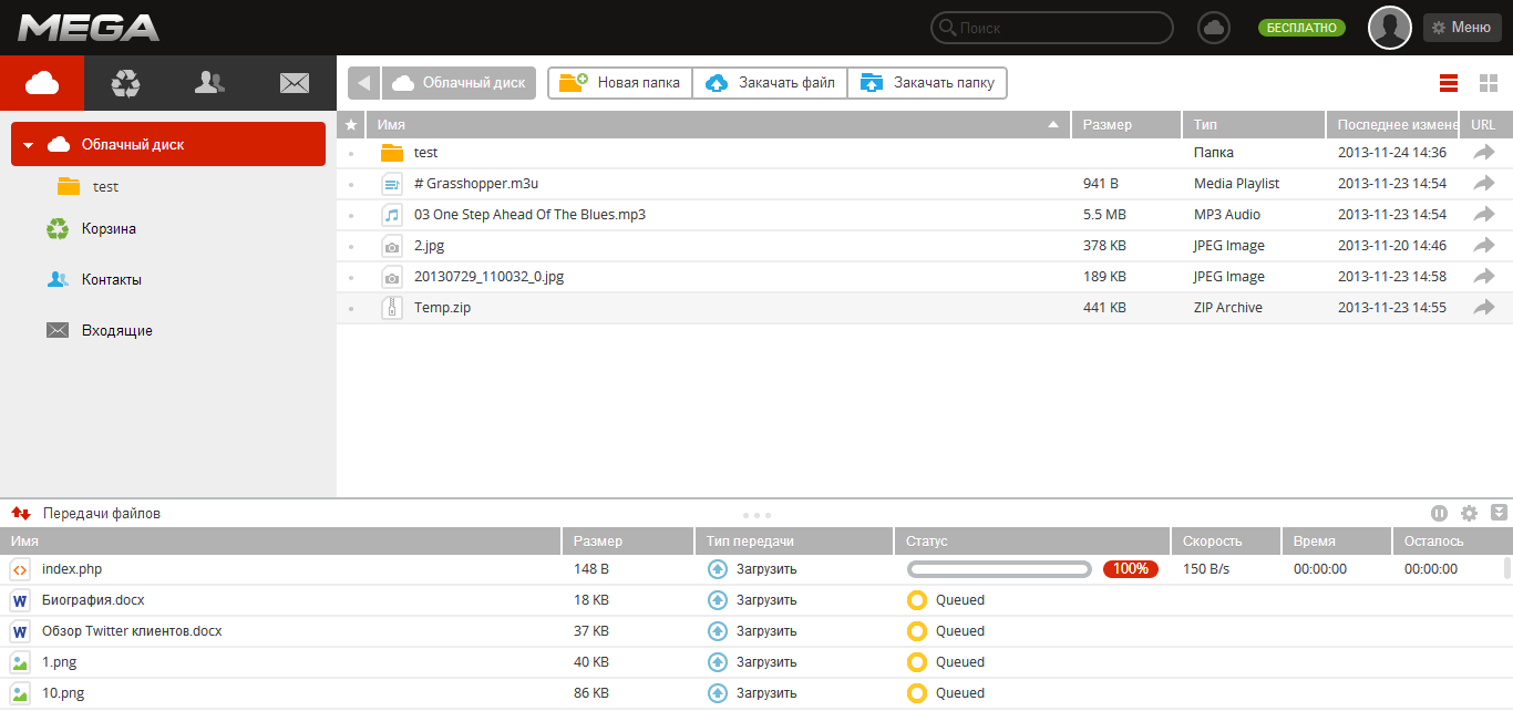 Внутри аккаунта Mega встречает минималистичным, удобным и быстрым веб-интерфейсом. В нем предусмотрена загрузка папок и перетаскивание, основные файловые операции. Вместе с тем, предосмотр файлов отсутствует. Неудобно и то, что в Mega нет настольного приложения для синхронизации, поэтому закачивать файлы приходится через браузер в однопоточном режиме, отслеживая процесс в панели передачи файлов.