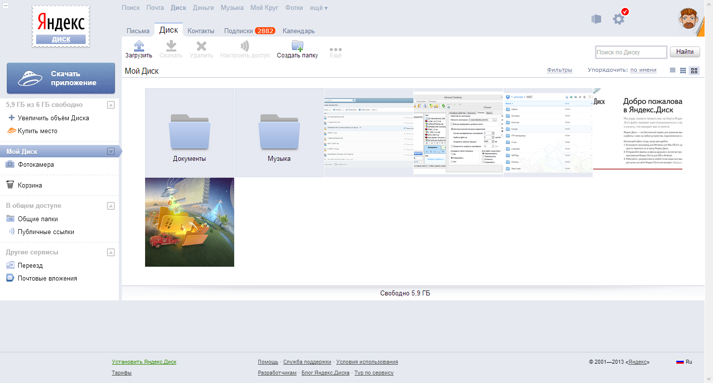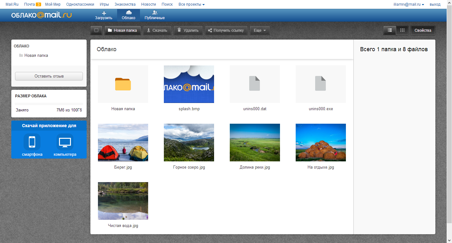 Изучив веб-оболочку «Облака», можно утверждать: она явно недоработана. Не поддерживается перетаскивание, при загрузке папок файлы копируются без сохранения структуры. Как стало привычно отмечать, нельзя загрузить через веб-интерфейс файлы более 2 ГБ. При этом альтернативных способов в наличии нет. С другой стороны, доступен предосмотр видео, изображений, презентаций, прослушивание музыки. Имеются режимы отображения данных на выбор, быстрая публикация ссылки (в списке числятся русскоязычные сервисы). Пользователям услуг mail.ru может быть полезной интеграция облака с почтой.