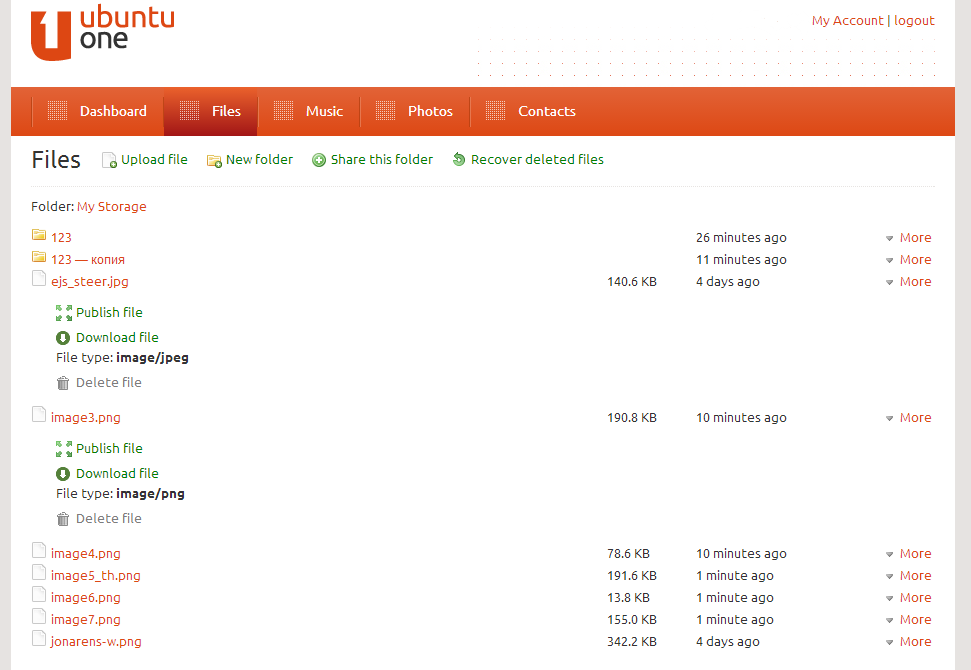 Сервис Ubuntu One совмещает в себе файловое хранилище на базе Amazon S3 и сервис для прослушивания музыки. 5 ГБ для хранения предоставляется бесплатно, плюс 6 месяцев действует специальное предложение: 20 бонусных ГБ пространства и доступ к функции Music Streaming. Стоимость 100 ГБ дополнительного пространства — $14,95/месяц (с учетом акций расценки могут варьироваться). Также, за счет приглашений по реферальной ссылке, можно бесплатно увеличить пространство до 20 ГБ (за каждого приведенного пользователя полагается 500 МБ).