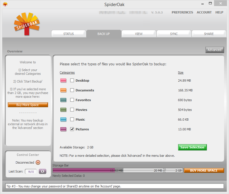Веб-интерфейс показал себя не с лучшей стороны — постоянно возникала ошибка доступа либо отсутствовала возможность управления данными. Настольное приложение SpiderOak справляется со своими задачами значительно лучше. Виджет отображает статус резервной копии, синхронизации, публикации, качество соединения. В соседних подразделах доступна информация о текущих заданиях и действиях, произведенных в аккаунте, журнал и статистика. Резервирование также можно производить вручную, определив список категорий.