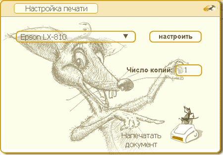 "Настроить страницу" - следующая кнопка панели управления. Через нее можно назначить размеры полей, вид страницы - альбомную или книжную. И все эти настройки выполняются на фоне веселого мышонка. Подобно настройке страницы выполняется и настройка печати. Здесь можно выбрать принтер, установить количество копий, выполнить настройку принтера (при этом открывается стандартное окно системы) и отсюда же отправить документ на печать. Но отсутствуют возможность выбора страницы или диапазона страниц для печати и настройка параметров печати.