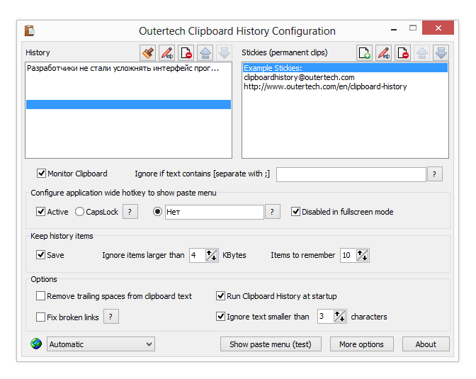 Окно приложения можно закрепить по краям экрана и расположить поверх других приложений. Вдобавок к этому, в настройках возможна настройка внешнего вида и горячих клавиш — как для взаимодействия с буфером обмена, так и для доступа к функциям программы.