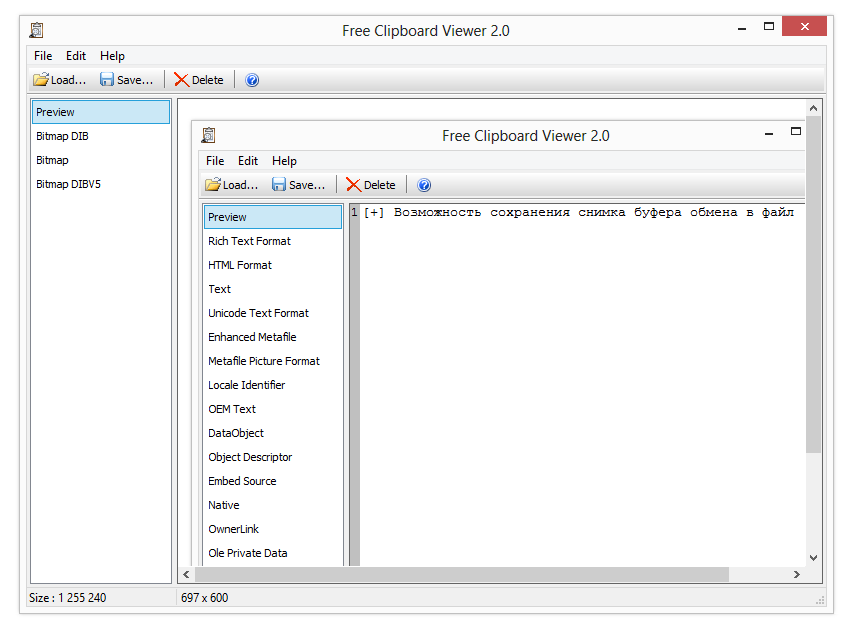 Согласно странице описания (см. Standard Clipboard Formats), Free Clipboard Viewer поддерживает все без исключения форматы хранения, определенные в ОС, их порядка 30: текстовые, графические, звуковые и другие мультимедиа форматы, списки и ссылки. В окне просмотрщика, в левой колонке, доступен выбор формата отображения данных буфера обмена. Например, сделав скриншот Рабочего стола, пользователь может открыть изображение, прочесть описание, а также узнать размер, побайтовую структуру файла (Bitmap DIB/DIBV5). А форматированный текст, помещенный в буфер обмена, во Free Clipboard Viewer содержит около 20 информационных разделов.