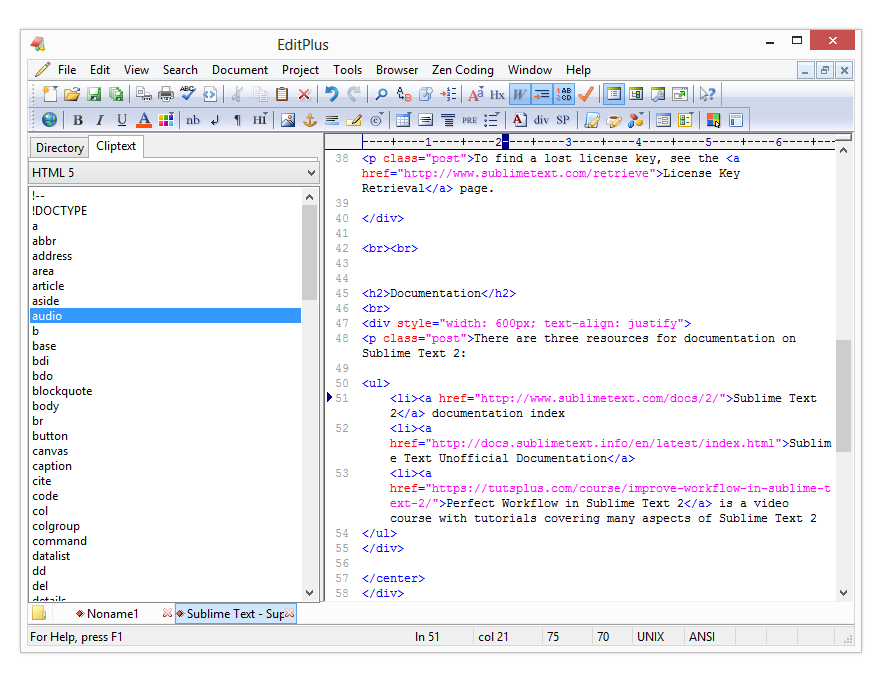 EditPlus изначально поддерживает форматы HTML, CSS, PHP, ASP, Perl, C/C++, Java, JavaScript и VBScript, но можно расширить список. Файлы STX отвечают за синтаксис, ACP — автодополнение, CTL — сниппеты (доступны через Cliptext Window, Alt + Shift + 1).