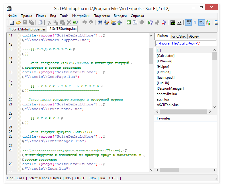 Интерфейс позволяет работать с вкладками и сессиями. Так или иначе, удобство графического интерфейса вызывает сомнения: сложно управлять обширным списком команд в меню. Поэтому, как вариант, можно посоветовать модификацию SciTE. Ее особенности — не только более дружелюбный интерфейс, но и поддержка русского языка, переведенная документация, расширенные возможности, дополнительные скрипты и утилиты.