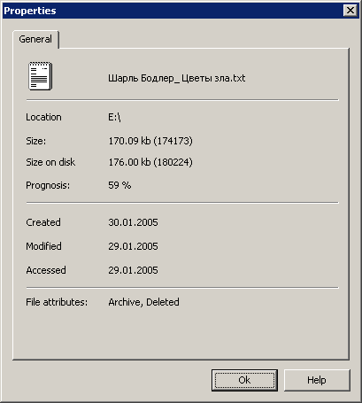 В окне результатов могут быть показаны как существующие, так и удаленные файлы. Отличаются они символом перечеркивания на иконке файла. Можно заранее оценить вероятность восстановления файла или папки, если либо посмотреть их параметры (из контекстного меню), либо после выделения файла или папки посмотреть на вновь открывшееся окно в панели управления. В нем будут показаны, помимо названия и типа файла, его размер (а также размер, занимаемый им на диске, - в зависимости от того, какую файловую систему обрабатывает программа), а также оценка вероятности восстановления. Эта оценка имеет три основных значения: восстановление возможно (good), невозможно (poor), восстановление возможно частично (average).