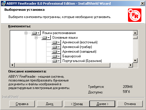 Если пойти по пути выборочной установки, то новичка может поразить количество языков, доступных для распознавания. ABBYY FineReader 8.0 поддерживает 179 языков распознавания, включая 36 языков со словарной поддержкой. Пользователи, не нуждающиеся в распознавании, например, каталанского, эстонского или, скажем уйгурского языка, смело могут оставить лишь русский, английский, немецкий и французский языки. Кому-то, возможно, понадобится итальянский или испанский. Можно распознавать тексты, написанные на формальных языках, таких как языки программирования (Pascal, Basic, C/C++), можно работать с искусственными языками (эсперанто, идо, интерлингва). В общем - есть простор для выбора.
