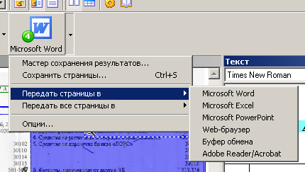 Для того, чтобы сохранить результаты распознавания в файл, нажмите на стрелку справа от кнопки Сохранить и выберите команду Сохранить страницы... Распознанный текст можно сохранить в следующих форматах: RTF, DOC, Word XML, XLS, PDF, HTML, PPT, TXT, DBF, CSV, LIT.