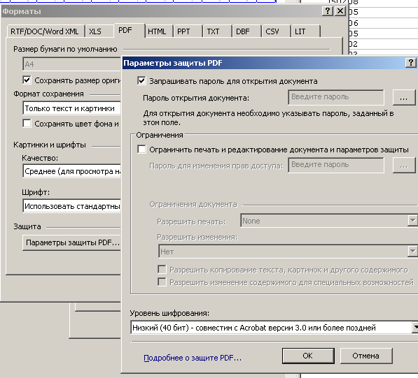 Также появилась возможность защиты PDF–файлов паролем. Пароль может быть установлен как на открытие файла, так и на прочие действия с документом (печать, извлечение содержимого, возможность редактирования, внесение комментариев, добавление/удаление страниц и др.). Предусмотрена возможность выбрать один из трёх уровней шифрования: 40-битный, 128-битный на основе стандарта RC4, 128-битный уровень, основанный на стандарте AES (Advanced Encryption Standard).