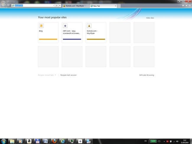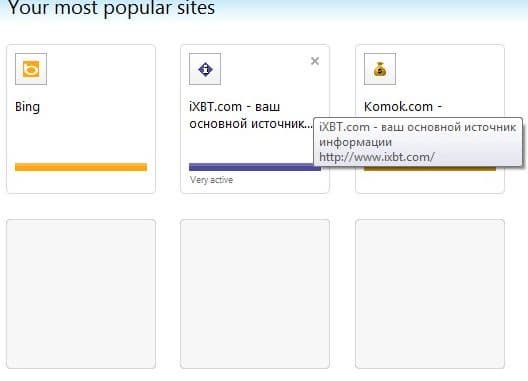 В новом IE реализована более интересная технология — здесь тоже есть большие окошки с названиями сайтов, но это не фиксированный список. В него попадают наиболее часто посещаемые сайты, а полоска внизу показывает, насколько часто пользователь туда ходит. Это намного удобнее, чем постоянно лазить и менять фиксированный список — система сама отберет ваши любимые сайты (а ведь на любимые сайты вы ходите чаще всего, не так ли?) и именно они будут в вашем личном топе.