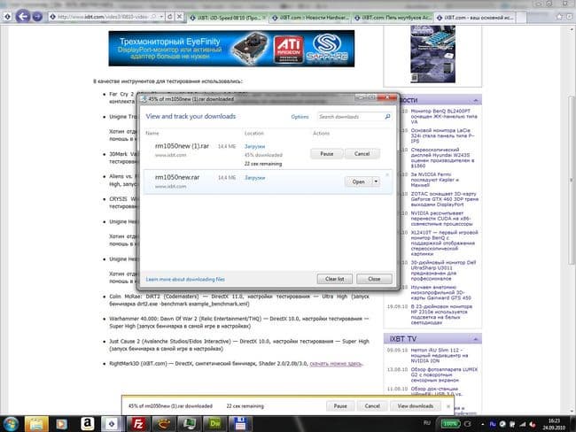 Новый менеджер закачек в IE9. Показывается процент загрузки и остаток времени, нет только скорости загрузки.