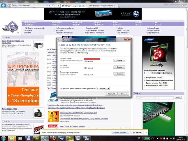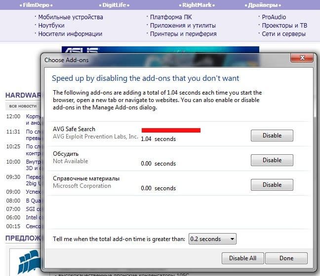 Однако их загрузка занимает дополнительное время, и очень часто они просто не оптимизированы для быстрой работы (это если они вообще загрузились, а не грохнулись в процессе, увлекая за собой и весь браузер). Поэтому открывающееся окно браузера вынуждено ждать загрузки надстроек — и это очень замедляет скорость работы и отклик окна в целом. Поэтому в IE9 встроен специальный инструмент, который замеряет время старта надстроек и показывает их список, а пользователь может отключить те из них, которые крадут скорость работы с интернетом.