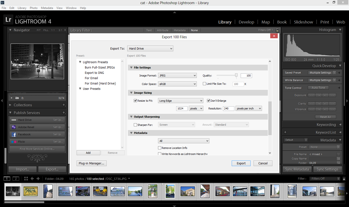 Рассмотрим также известную программу для работы с фотографиями Adobe Lightroom. Здесь выполнить массовое преобразование можно во время экспорта изображений при помощи модуля «Library» и команды меню «File — Export…». Настройки следующие: