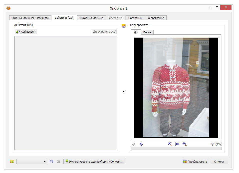 XnConvert — «отпочкование» от популярного просмотрщика изображений XnView. По сути, все те же самые действия, производимые в среде XnConvert, можно произвести и в XNView (о чем ниже), однако автономный конвертер имеет ряд отличий. Прежде всего, он не предназначен для просмотра. С одной стороны, ничего не отвлекает от функционала. С другой — если нужно узнать самую базовую информацию об исходном файле, приходится обращаться к другой программе-просмотрщику.