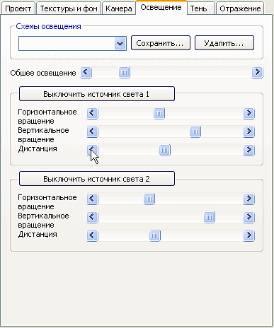 Следующая закладка - "Освещение". У вас есть два источника света, каждым из которых можно управлять в отдельности. Вы можете отключить любой из них, изменить его положение относительно изделия (вращать в горизонтальной или вертикальной плоскости), изменять расстояние до изделия. Результаты при включенной автоматической прорисовке будут видны немедленно. Если схема размещения источников света вас удовлетворяет, ее можно сохранить и использовать в дальнейшем.