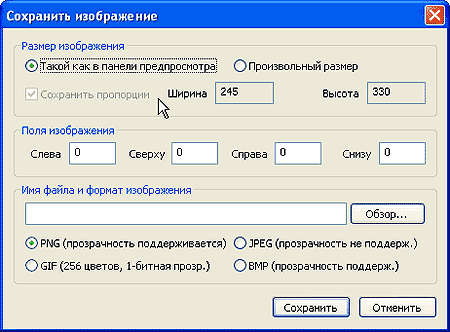 Но вот работа выполнены, вы добились желаемого результата. Осталось немногое - сохранить его в виде рисунка для дальнейшего использования на сайте или в документации. Сохранить можно в одном из уже упоминавшихся графических форматов. Поиграть можно размером сохраняемого изображения - либо сохранить его в том размере, в каком он имеется в окне предпросмотра, либо выбрать собственные размеры, при этом желательно не отключать опцию "Сохранение пропорций". И еще одна настройка - определение размеров полей изображения.