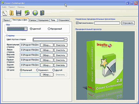 Компания Insofta Development предлагает весьма простое и удобное решение - программу Insofta Cover Commander. Здесь вы не сможете делать дизайн, но вот наложить подготовленные решения на коробку или CD-диск, разглядеть со всех сторон, сформировать изображение коробки или диска для сайта легко и просто. Разберем, как и что можно делать в этой программе.