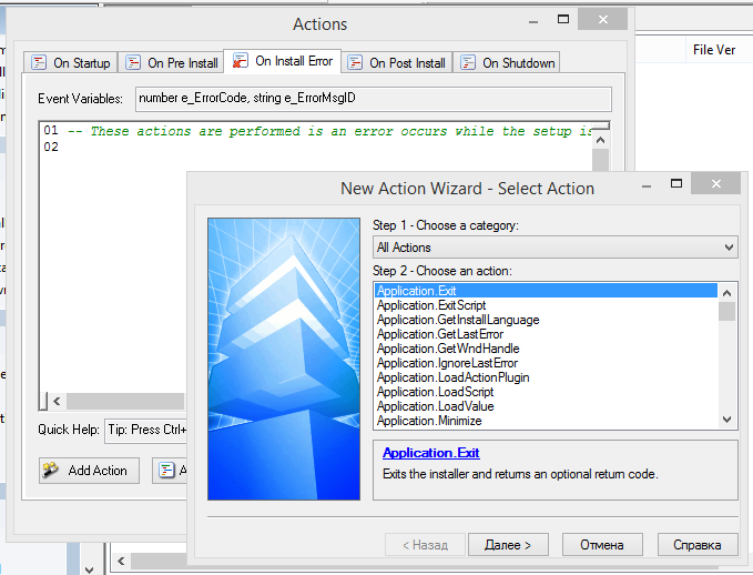 Управление скриптами осуществляется через секцию Actions. Все действия делятся на несколько этапов, в хронологическом порядке: запуск, процесс установки и возникновение ошибок на данном этапе, окончание установки и завершение работы.