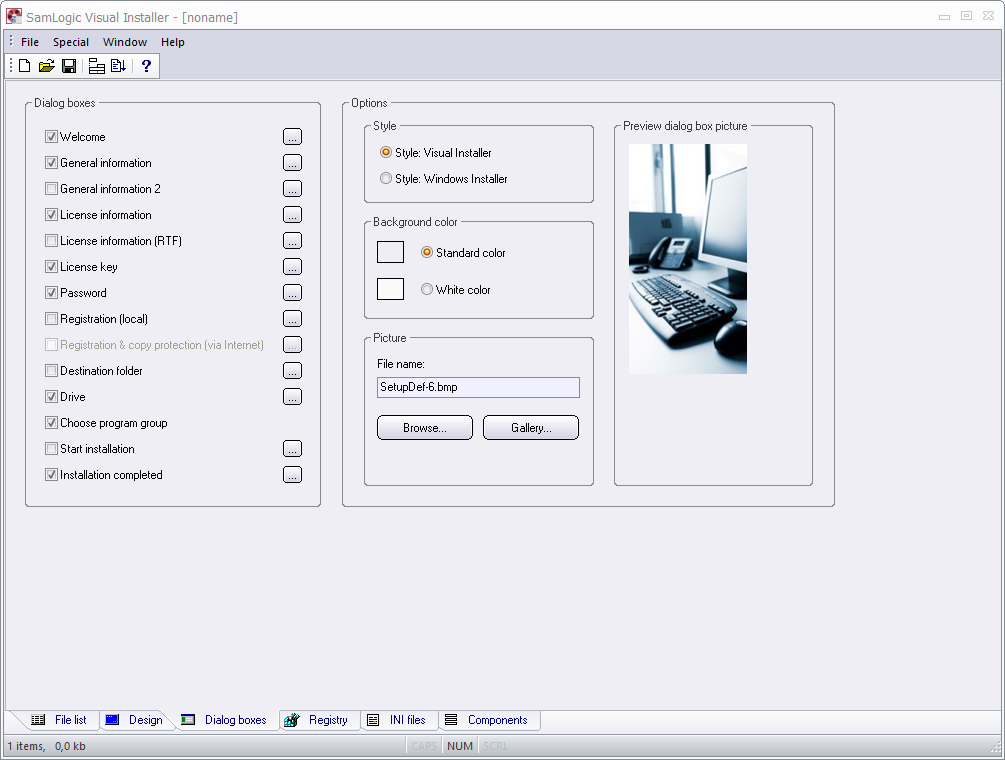 Далее работа осуществляется непосредственно в редакторе. В нижней его части доступны вкладки для навигации между разделами. В разделах File list, Registry, INI Files и Components определяется структура инсталлятора, включая файлы, директории, ключи реестра и другие компоненты. Отдельно можно выделить визуальную составляющую. Так, при настройке мастера установки предоставляется выбор диалогов (вкладка Dialog Boxes): ввод ключа лицензии, выбор компонентов, текст лицензии и т. д. Дизайн установщика определяется в соответствующей вкладке Design: это цвет, фон, шрифты, изображения и звук.