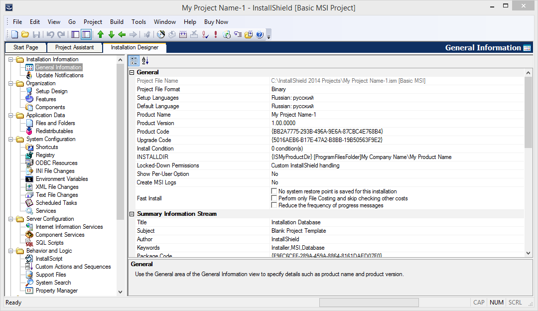 Есть несколько вариантов начала работы в InstallShield, один из них — воспользоваться пошаговым мастером настройки (Project Assistent), который запускается автоматически при создании нового проекта. Более детальная конфигурация осуществляется в окне дизайнера установки. Настройки сгруппированы следующим образом: