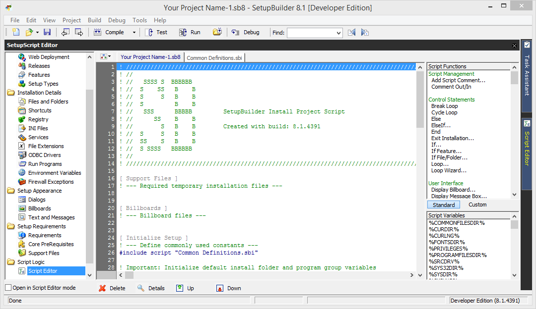 Script Logic — доступ к сценарию инсталлятора. Для работы со скриптами используется собственная IDE-среда, также имеется встроенный визуальный дебаггер. В SetupBuilder задействован скриптовый язык SetupScript, и, в случае с редакцией Developer, прилагается около 500 предустановленных функций. Кроме использования SetupScript, во время установки можно обратиться Windows API или подключить необходимые DLL-библиотеки.