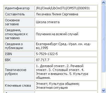 В третьей части окна просмотра выводится подробная информация о выделенной записи. Эта информация может выводиться в одном из трех форматов — требование (полное и краткое) и библиография. Требование — это таблица из двух столбцов. Форма ориентирована на читателей, поскольку в распечатанном виде подобна требованию, заполняемому в обычных библиотеках. Библиография представляет собой аналог библиографической карточки, приближенный к стандарту ГОСТ 7.1-84 (ИСО 690-87). Дополнительно приводятся идентификатор записи и месторасположение документа.