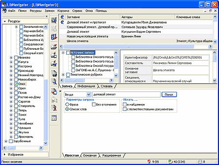В интерфейсе программы библиотечные ресурсы представлены в виде дерева, в котором их можно группировать по территориальному или тематическому признаку. При выполнении поиска требуется отметить ресурсы, которые будут задействованы, — поиск будет вестись только по их базам данных. В том случае, если у вас есть постоянно используемые ресурсы, для удобства их можно поместить в папку "Избранное" и при выполнении поиска использовать эти отобранные ресурсы.
