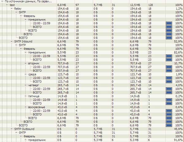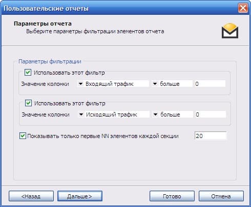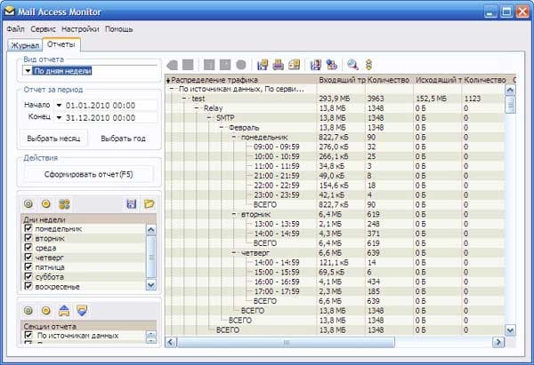 Для анализа использования почтового сервера в большей степени удобен не журнал, а отчеты, которые можно формировать на основе имеющихся данных. Отчеты позволяют просмотреть информацию, сгруппированную по тому или иному аналитическому признаку за определенный период времени. Для работы с ними служит вторая закладка основного окна программы.