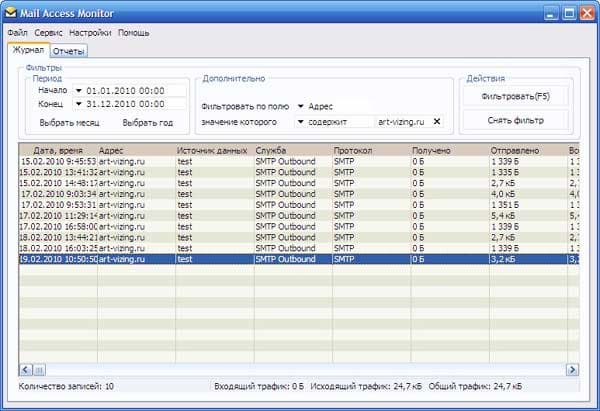 Итак, если не использовать фильтр, то в журнале можно будет увидеть весь список отправленных и полученных почтовых сообщений. Отсортированы записи будут по времени. Отфильтровать их можно по нескольким параметрам. Первый — период, за который вы хотели бы увидеть информацию. Здесь можно указать начальную и конечную даты. В качестве дополнительных параметров можно задать фильтр по значению одного из полей «Адрес», «Получено», «Отправлено», «Всего». Для каждого поля должны быть введены в качестве параметров соответствующие значения и условие сравнения. Например, для поля «Всего» можно выбрать размер почтового отправления и условие «больше», «равно», «меньше».