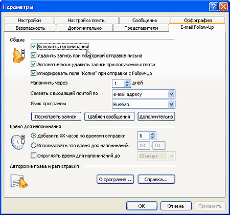 На мой взгляд, очень удобен плагин E-mail Follow-Up, который отвечает за получение ответов на отправленные сообщения. При отправке письма через дополнительные кнопки плагина ("Follow-Up" и "Произвольный Follow-Up") в календаре создается запись для отправленного письма с напоминанием о необходимости получения ответа. Что считать ответом на письмо - устанавливается в настройках модуля. По прошествии установленного времени, если ответ не был получен, для пользователя будет сформировано соответствующее напоминание и будет предложено либо отправить повторное письмо (шаблон для которого вы должны разработать сами), либо будет открыто исходное письмо, с тем чтобы отправить его еще раз. При получении ответа запись из календаря удаляется.