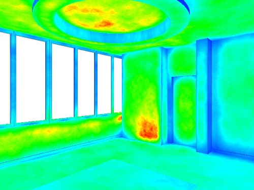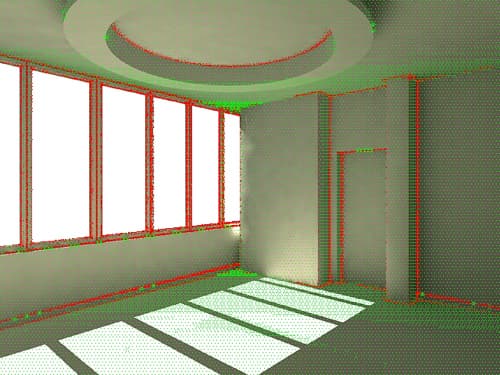 Хотя на предварительном этапе проводится серьезная работа по отбору и расчету FG-точек, далеко не все видимые в камеру точки поверхностей трехмерных объектов могут быть интерполированы по ним на этапе рендеринга. Все точки, которые рассчитываются методом Монте-Карло на этапе рендера, на диагностическом рендере показываются красным цветом. Основная причина возникновения такой ситуации – близость некоторых точек к границе объекта: если точка попадает достаточно близко к границе объекта, для нее может не найтись FG- точек для интерполяции, поскольку зона поиска "обрезается" границей поверхности.