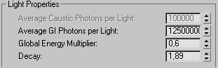 Другое нововведение – максимальное количество излученных источником фотонов подстраивается под заданную величину интенсивности источника. Если интенсивность выше, количество излученных фотонов больше и наоборот. Поэтому, в настройках света рассматриваемой панели говорится об Average, т.е. усредненном числе фотонов для каждого источника. Точное число излученных фотонов определяется с учетом как величины Average GI (Caustic) Photons per Light, так и с учетом интенсивности прямого света, заданное в настройках источника света.