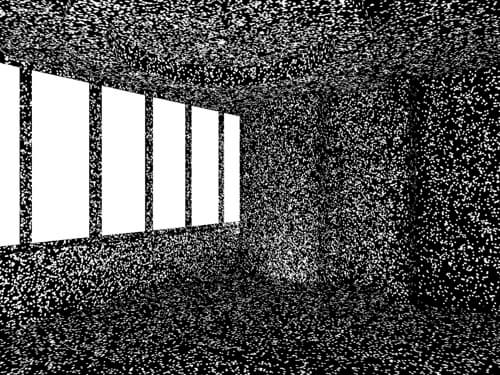 Результатом предварительной стадии FG - расчетов является набор выбранных точек, освещенность которых рассчитана методом Монте-Карло. В идеале, такого набора вполне достаточно, чтобы интерполировать освещение в любой точке поверхности, видимой в камеру, с заданной величиной ошибки. Координаты FG - точек, их рассчитанная освещенность и величины градиентов освещения сохраняются в базу данных того же типа, что и фотонная карта (kd-tree) для последующего использования (интерполяции) при рендере. Расчет освещения FG - точек выполняется с учетом величины accuracy (Final Gather Samples в 3ds max), задаваемой в настройках FG. Величина accuracy определяет максимальное количество сэмплирующих лучей для расчета освещения методом Монте-Карло. Точки, полученные на этом этапе на диагностическом рендере в 3ds max 7 отображаются как точки зеленого цвета.